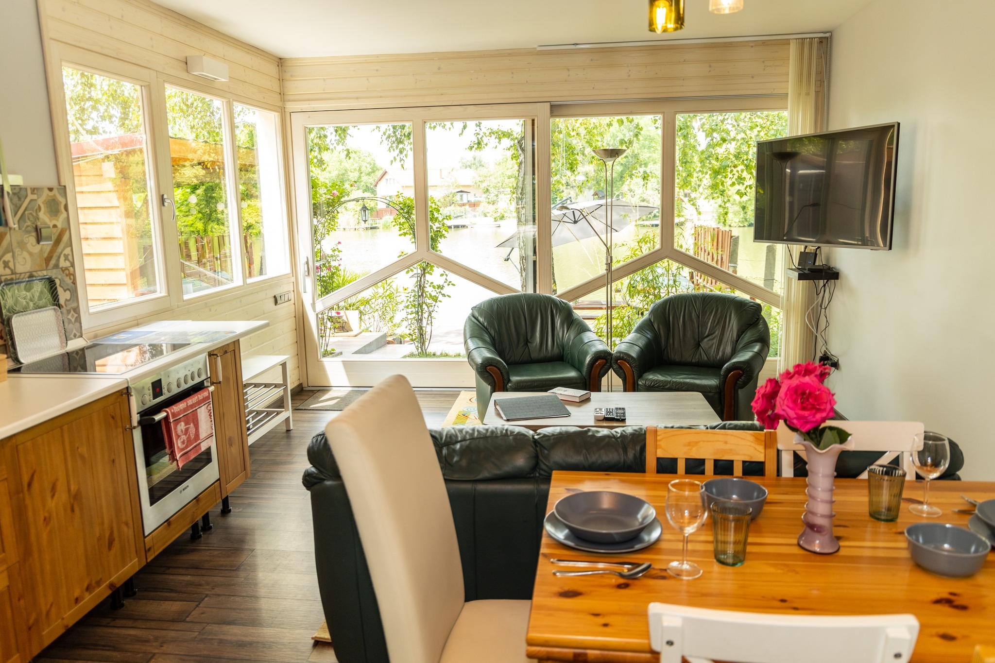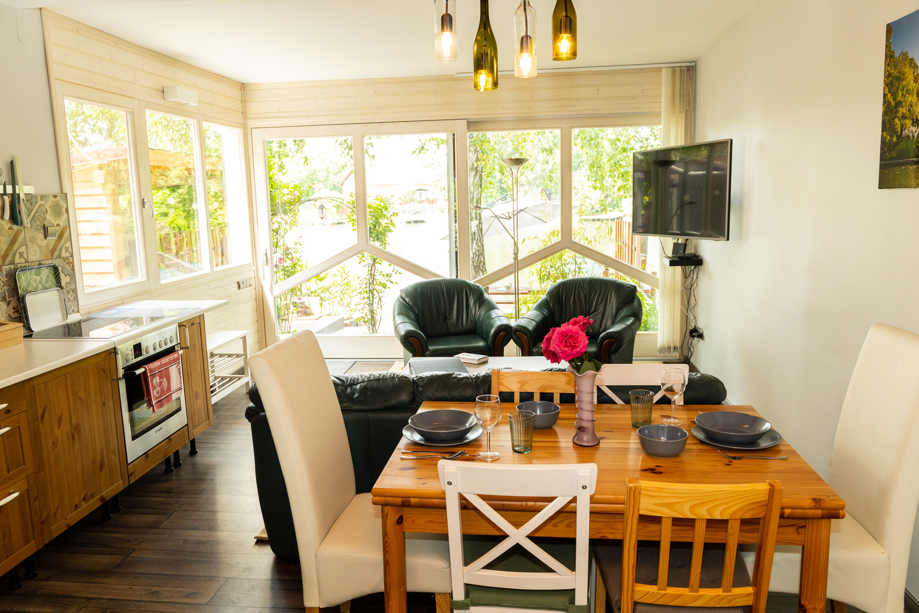 Jól felszerelt, önálló ház, más vendég nem tartózkodik a nyaralóban, nem kell közösködni, másokhoz alkalmazkodni. Egylégterű (50m2) + emeleti terasz (10m2) + stég(4m2) a 7m-es parton. A földszinten nappali,étkező, konyha egyben(26m2), az emeleten szoba.
