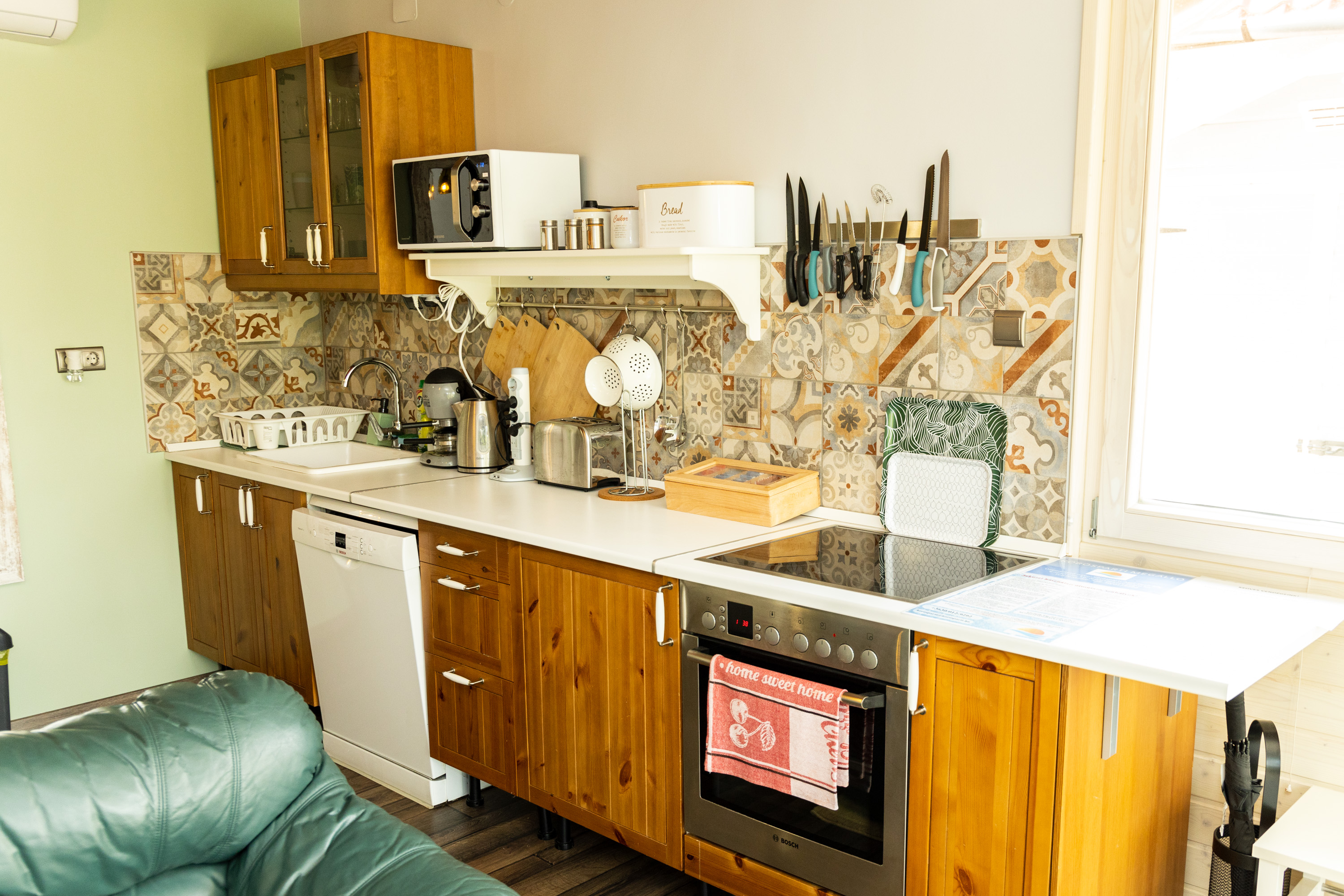 Teljesen felszerelt konyha (sütő, tűzhely, edények, mosogatógép, hűtő, mikrohullámú sütő, szarvasi kávéfőző, vízforraló, kenyérpirító) és étkező (az összes vendégnek elegendő ülőhely, étkészlet). Az emeleten(20m2):1 franciaágy (160x200), 2 szimpla ágy (90x200), a földszinten 1 nagy kihúzható kanapé. A földszinten zuhanyzós fürdő és külön wc. Minden normál ágyon rugalmas ágyrács és minimum 17cm-es matrac van. Minden ágyhoz komplett ágynemű (paplan, nagypárna, kispárna) adunk huzattal, + takaróval és igény esetén törölközőt biztosítunk. Hűtést-fűtést 2 db klíma biztosítja. A nyaralóban vezetékes víz van.